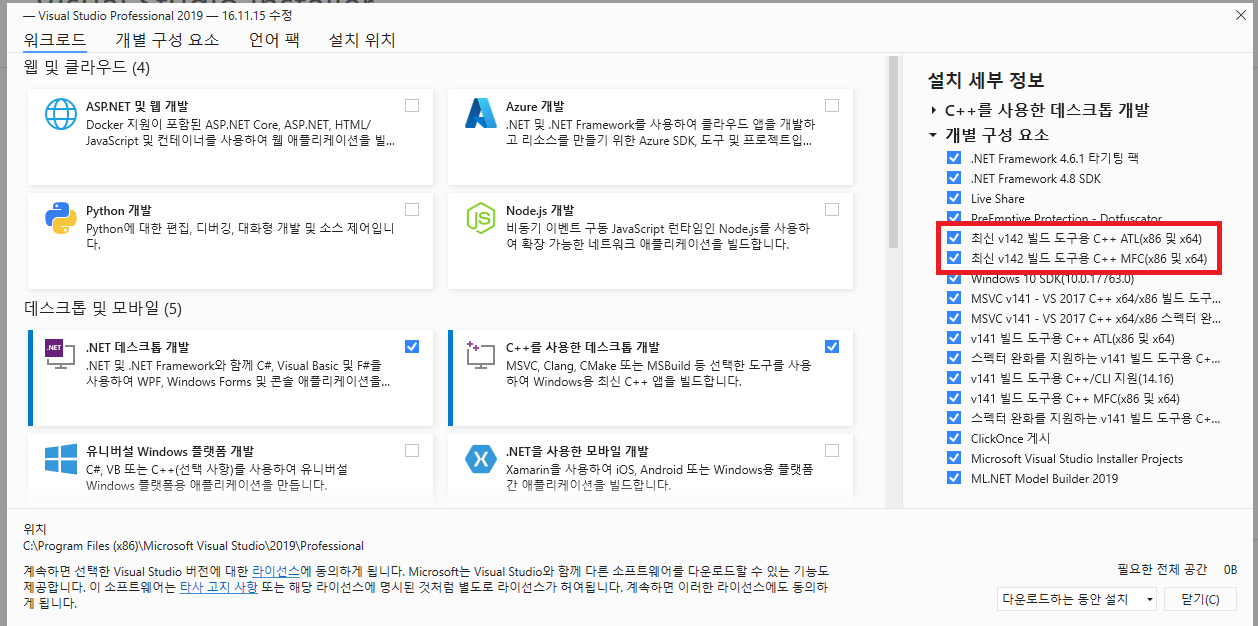 '개별 구성 요소 - 최신 v142 빌드도구용 MFC' 를 다운로드해 주었다.