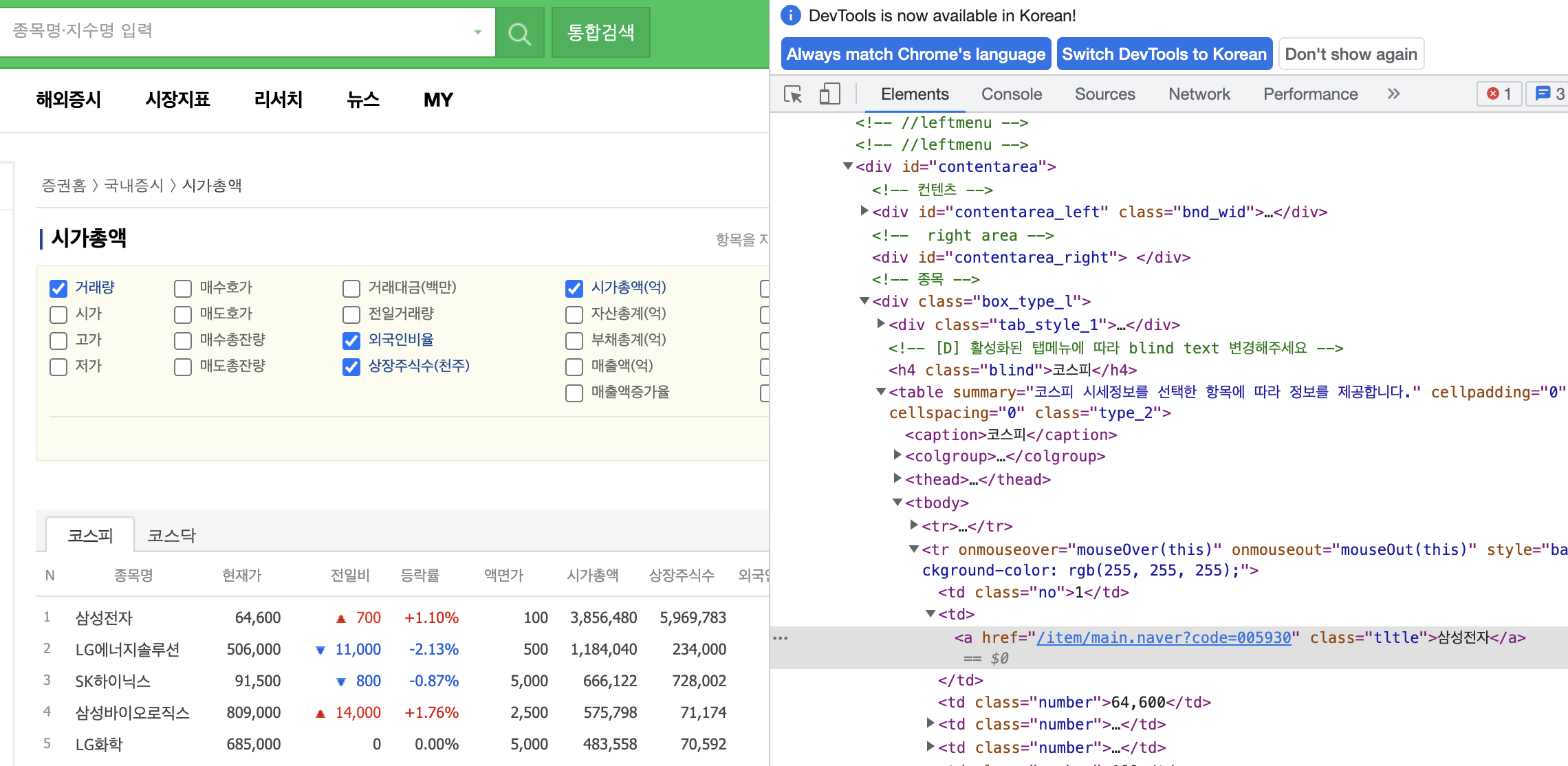 네이버 증권 - 국내증시 - 시가총액에 있는 항목들의 데이터를 크롤링하여 올 것이다.
