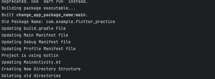 명령어를 flutter 프로젝트 루트에서 실행을 시키면 아래와 처럼 사용자가 설정한 패키지 이름으로 업데이트를 진행 해준다. 그러면 끝!