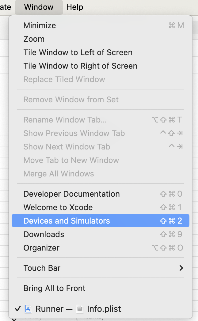 2. Xcode의 Window 탭을 클릭한 후, Device and simulators를 클릭한다.