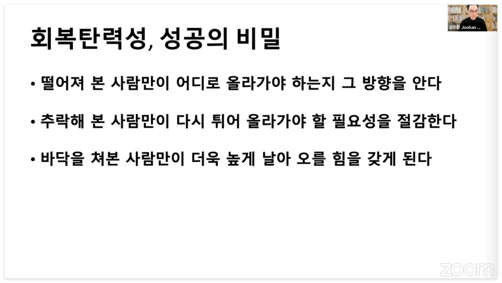 - 회복 탄력성이 있으면, 역경이 있으면 올라간다. 사람 뿐만 아니라 조직또한 똑같다.