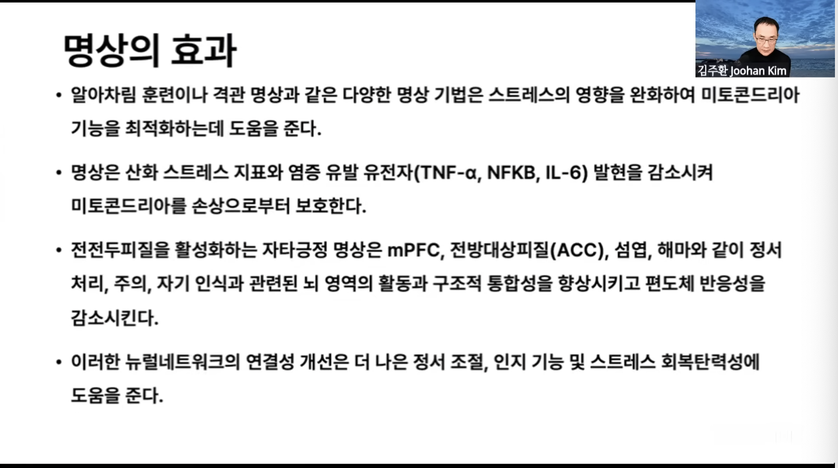 - 명상 전후에 염증이 떨어지는 실험이 많다.