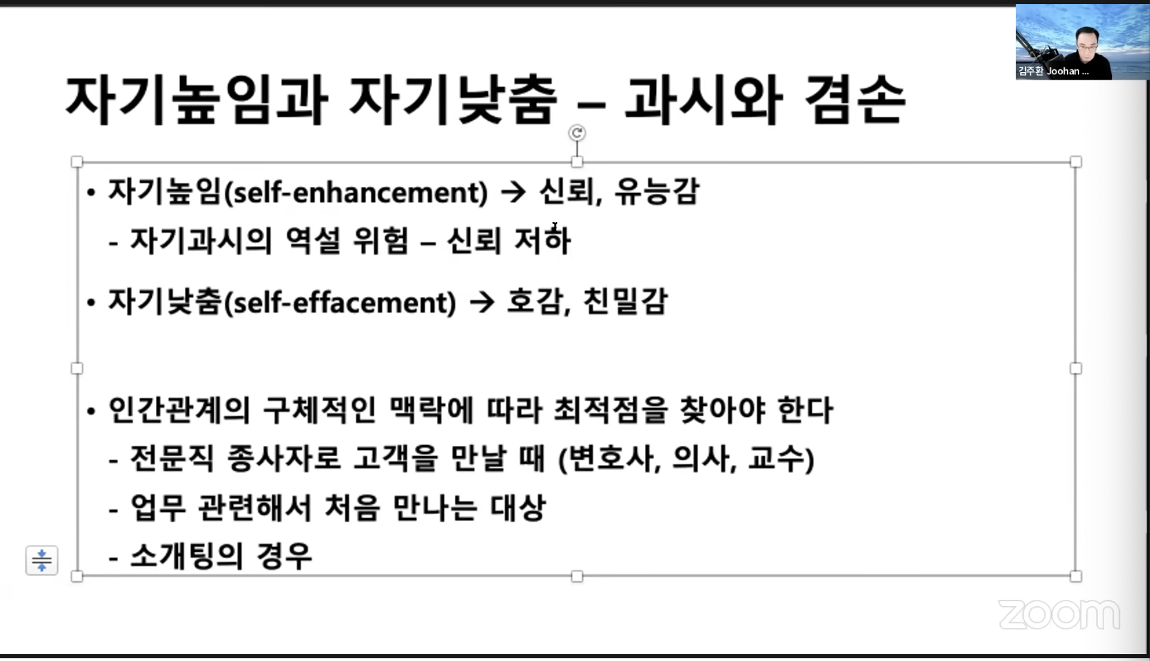 - self-enhancement : 링크드인 같은곳에 이력, 경력 등 올리는 행위들 or 자소서 or 인스타에 내가 어떤 책을 읽고 있다는 식의 자기 과시를 나타낸다. 이것을 안하고 살 수는 없다. 그래야 신뢰와 유능감이 오기 때문이다. 하지만 맥락에 따라 다르기 때문.