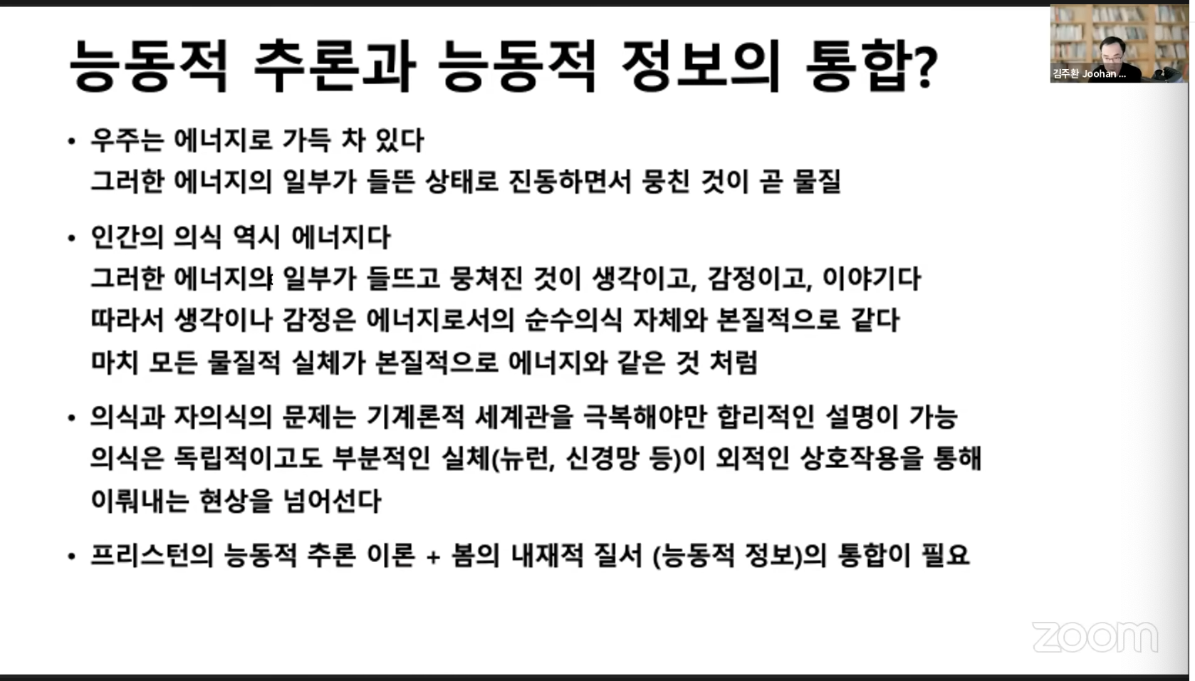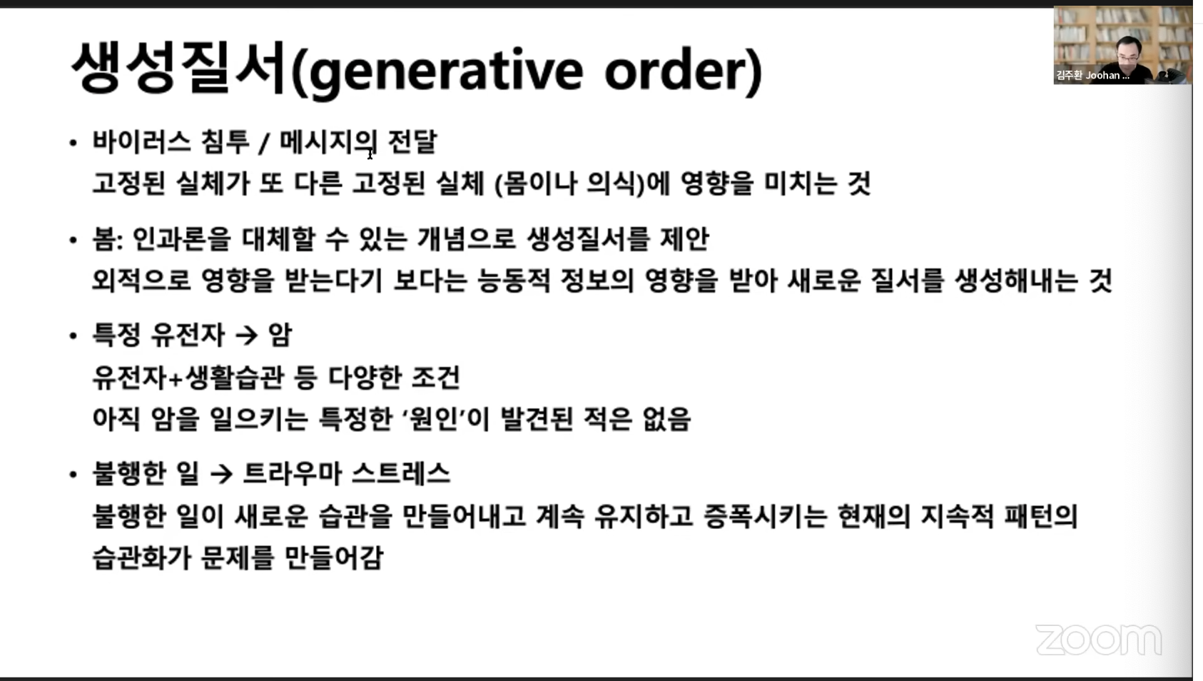 이번 강의를 듣고 들었던 생각은 법륜스님의 즉문즉설에 가끔씩 질문자들에게 했던 말인 "비디오를 또 돌리고 있다" 라는 말이 생각이 났다. 그것이 여기서 말하는 생성질서와 동일한 의미일 수 있겠구나 생각을 하게되었다.