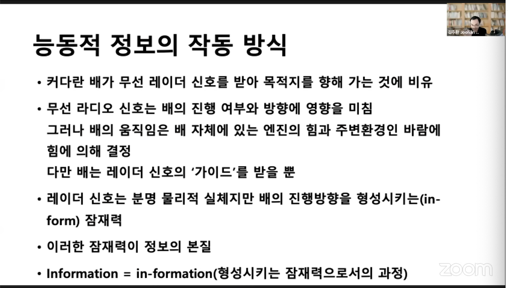 - 외부에서 들어오는 메시지는 단지 계기일 뿐이다. 그 이후 증폭하는것은 생성질서에서 한다.