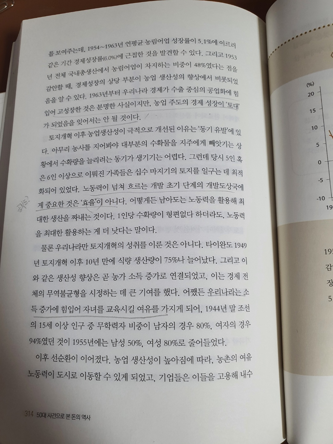 P314 : 공산화 위험퇴치 토지개혁 진행 -> 농업주도의 경제성장 토대 -> 소득 증가 -> 자녀교육 -> 우리나라 성장