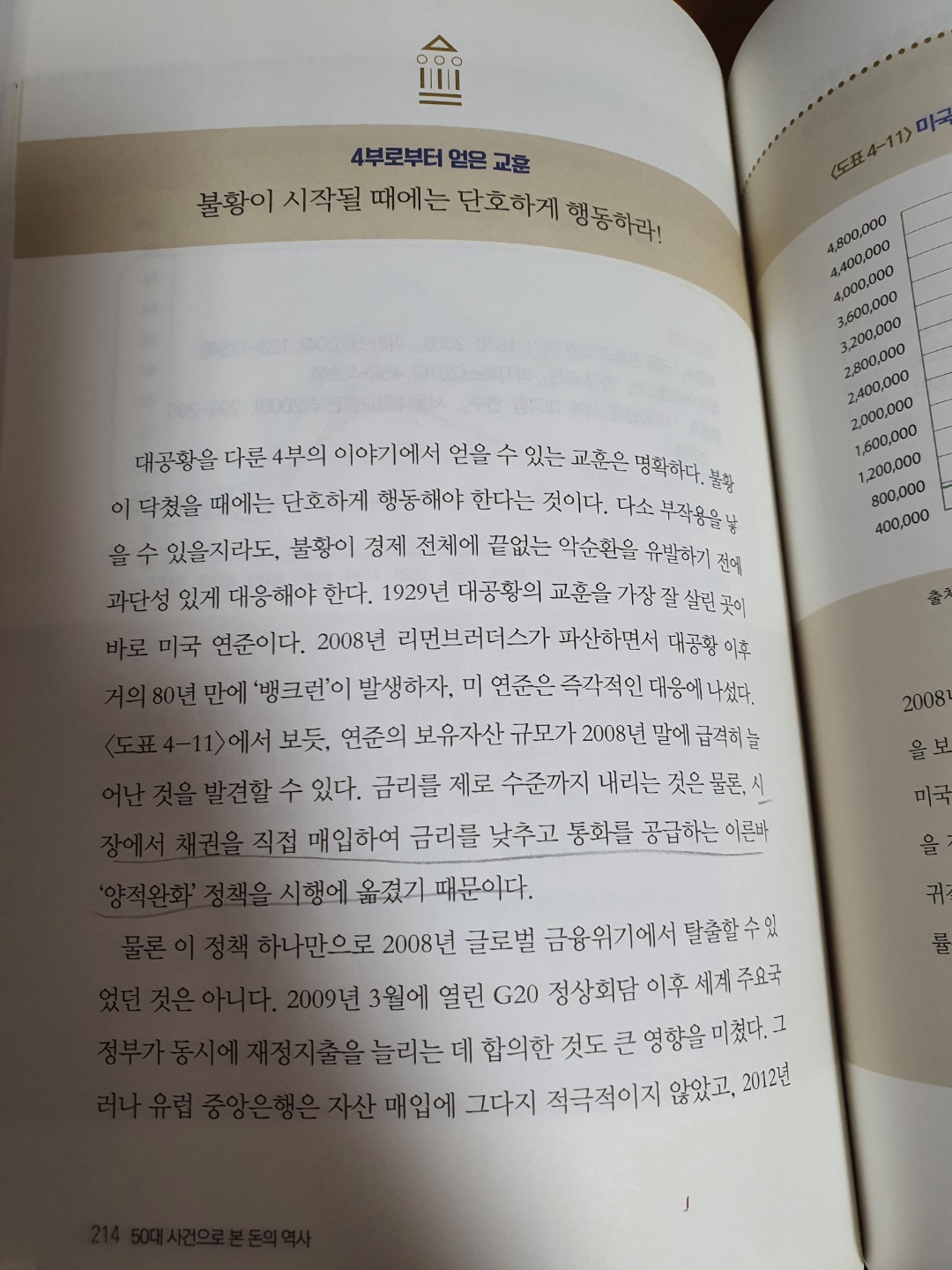 P214 : 2008년 글로벌 금융귀기 시장에서 채권을 직접매입하여 금리를 낮추고 통화를 공급하는 이른바 '양적완화'정책을시행에 옮겼기 때문