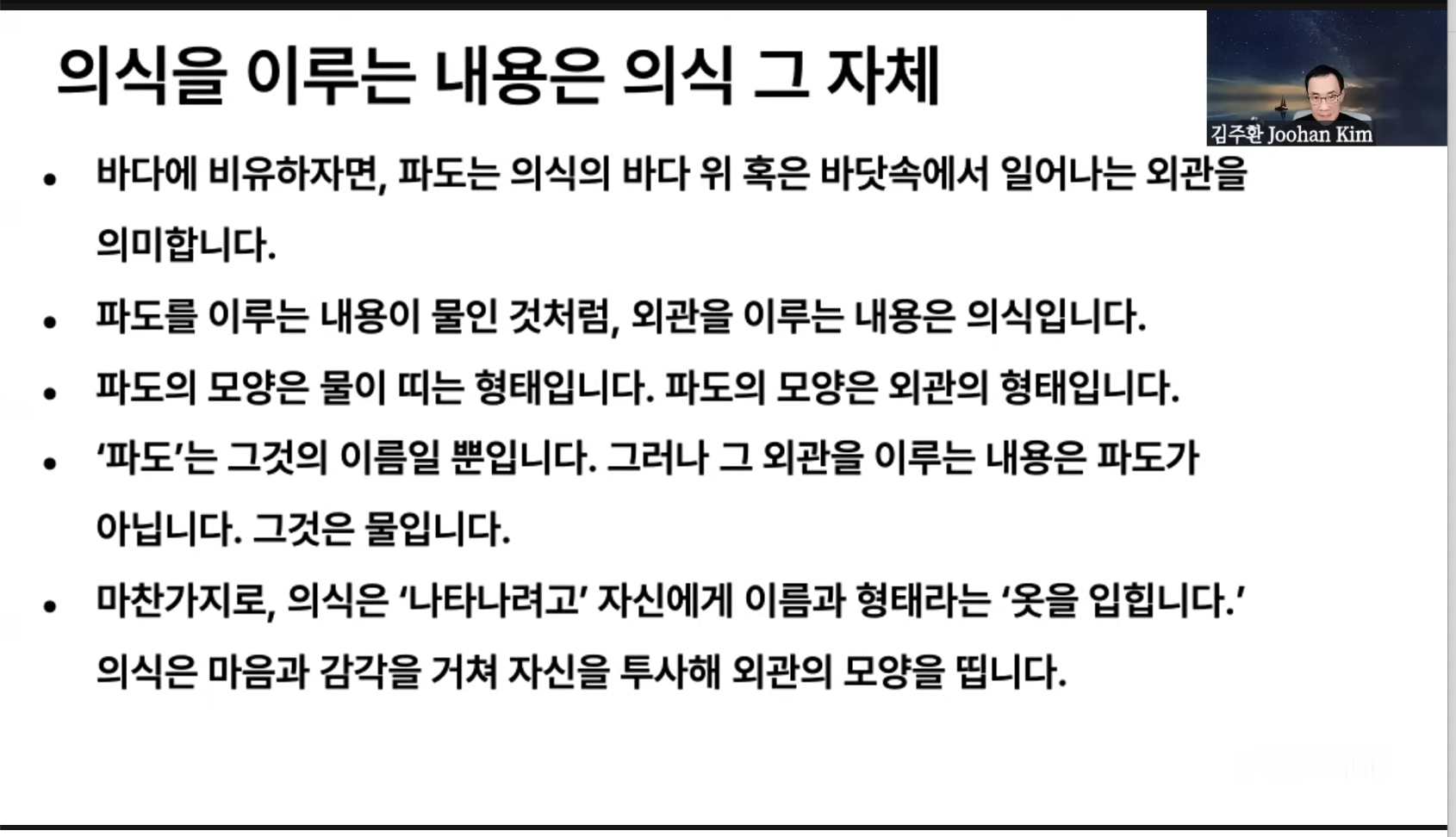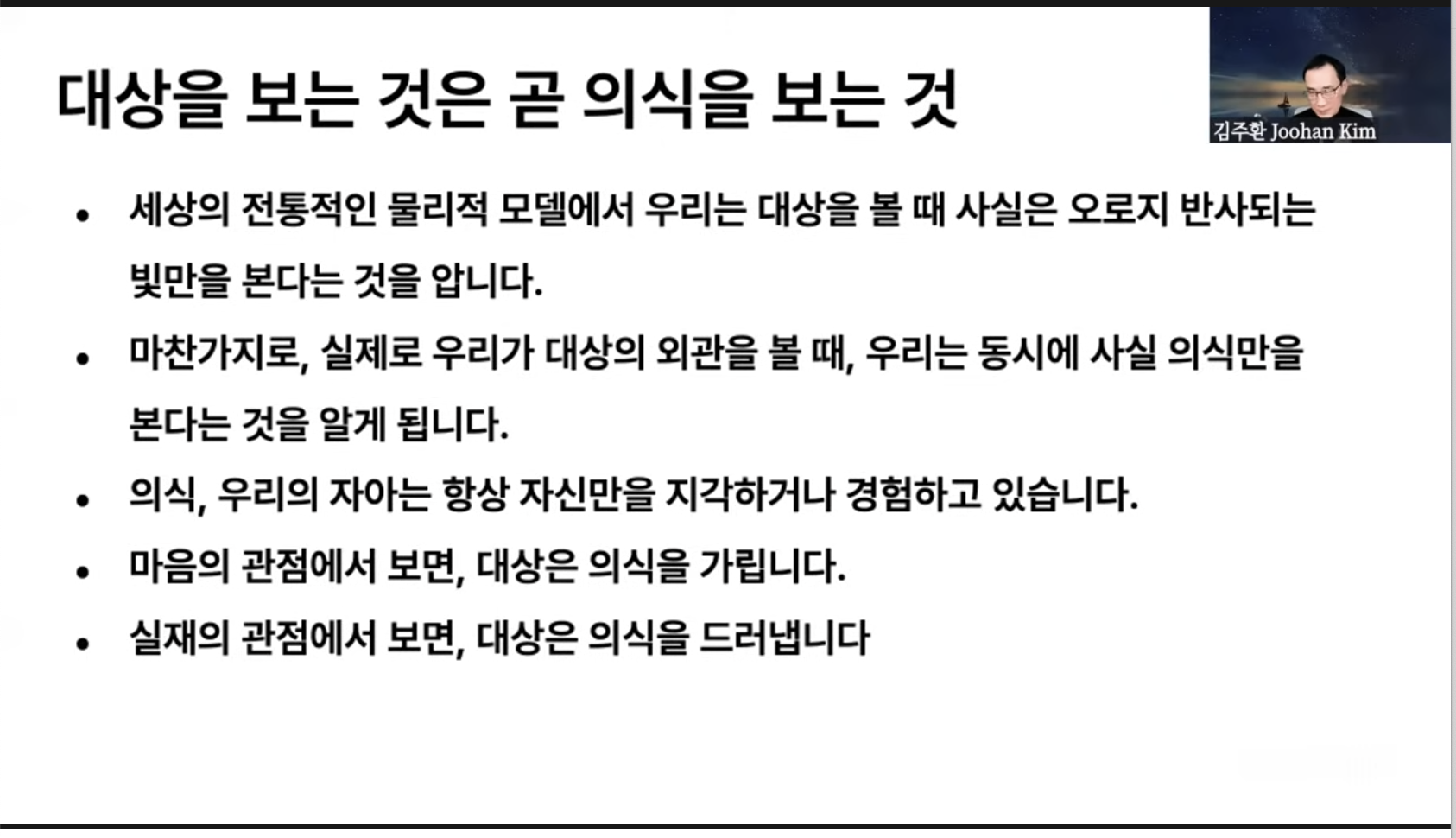 - none dualism은 이 우주가 주체와 대상이 한 덩어리라고 인식하는 인식주체가 있다고 생각하게 된다. 모든걸 하나라고 하는 순단 다시 dualism에 빠지게 되서 불이론을 이야기 하고 있는 것 이다.