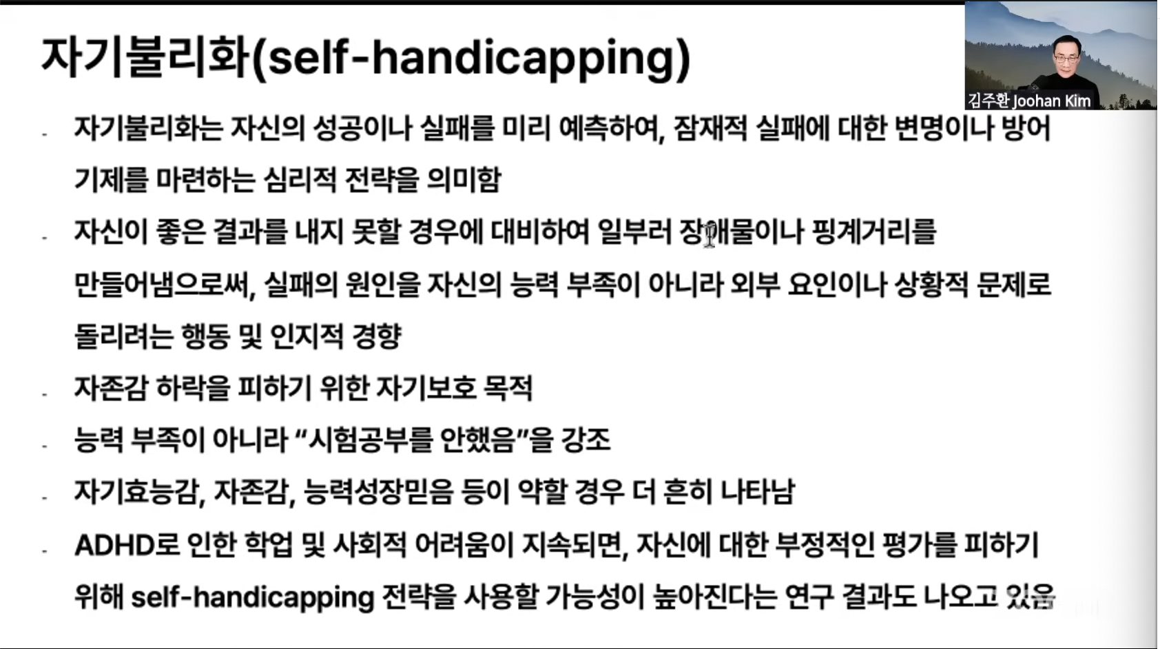 - 자기불리화 : 시험 전에 오히려 시험 공부를 하지 않는다 -> 시험을 망친다 -> 시험은 내가 무능해서가 아니라 시험 전에 공부 안해서 그래