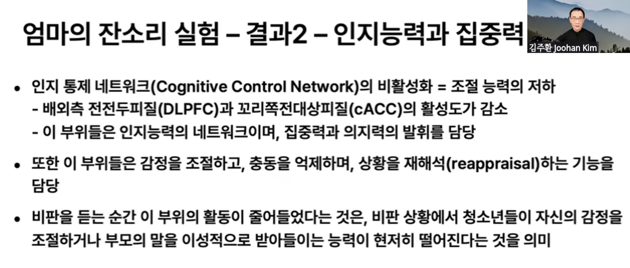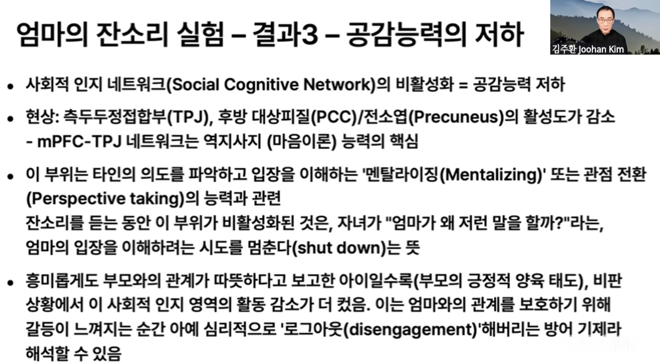 mPFC-TPJ가 잘 발달되지 못하는게 자폐스펙트럼이다. 이는 상대방의 입장을 이해하고 헤아릴 수 없다인데, 잔소리를 듣는 순간 여기가 비활성화 되어 버린다.
