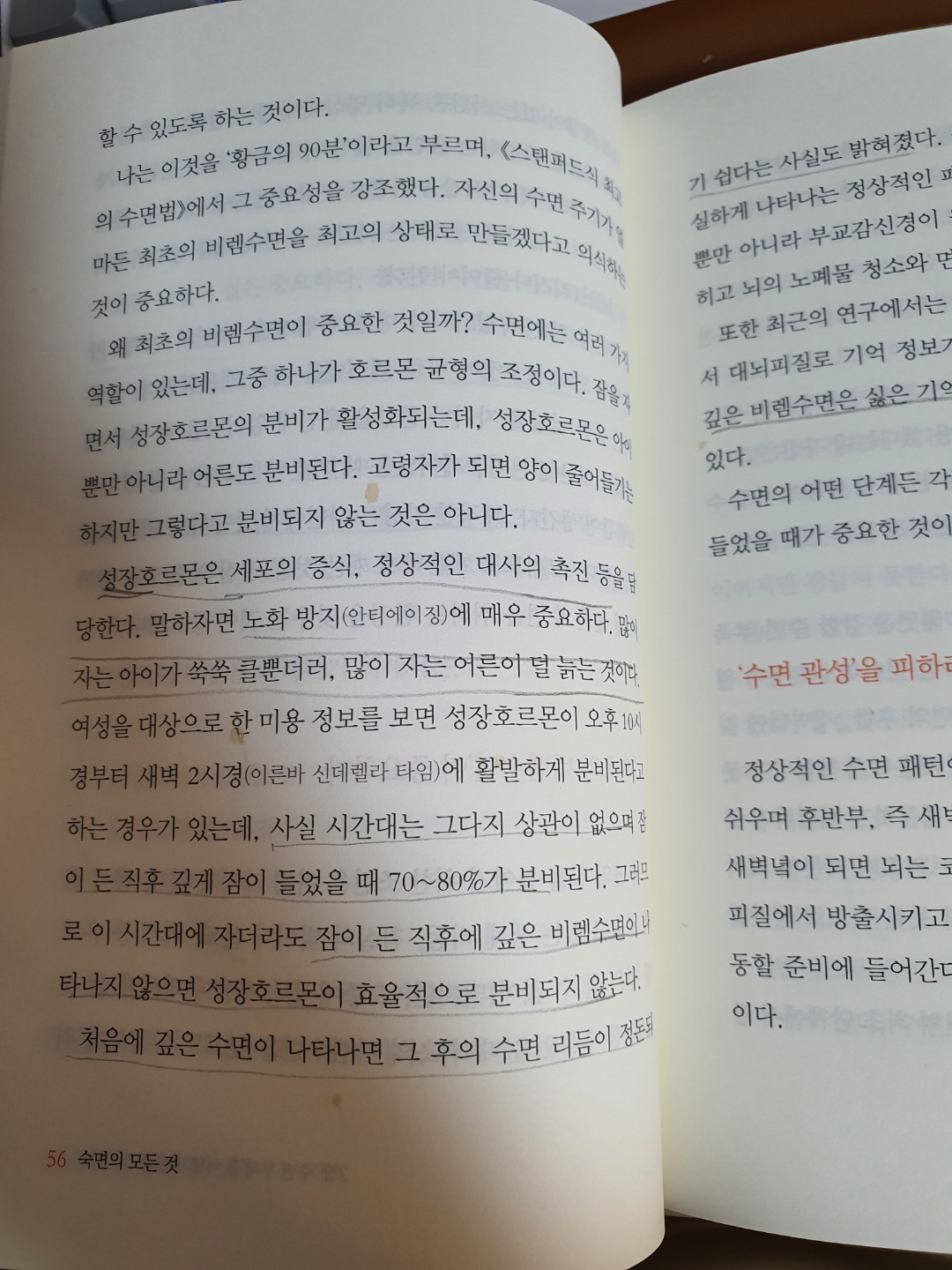 P56 : 성장호르몬은 세포의 증식, 정상적인 대사의 촉진들을 담당한다. 말하자면 노화방지에 매우 중요하다. 사실 시간대는 그다지 상관이 없으며 잠이든 직후 깊게 잠이 들었을 때 70~80%가 분비된다.
