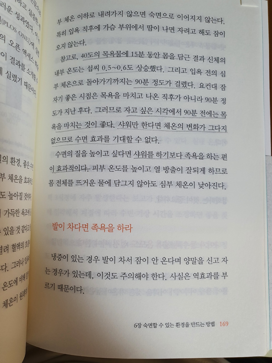 P169 : 40도의 목욕물에 15분동안 몸을 담근 결과 신체의 내부온도는 섭씨 0.5 ~ 0.6도 상승했다. 입욕전의 심부 체온으로 돌아가기까지는 40분정도가 걸렸다. 그러므로 자고 싶은 시작에서 90분 전에는 목욕을 마치는 것이 좋다. 샤워만 한다면 체온의 변화가 그다지 없으므로 수면 효과를 기대할 수 없다. 수면의 질을 높이고 싶다면 샤워를 하기보다 족욕을 하는 편이 효과적이다.