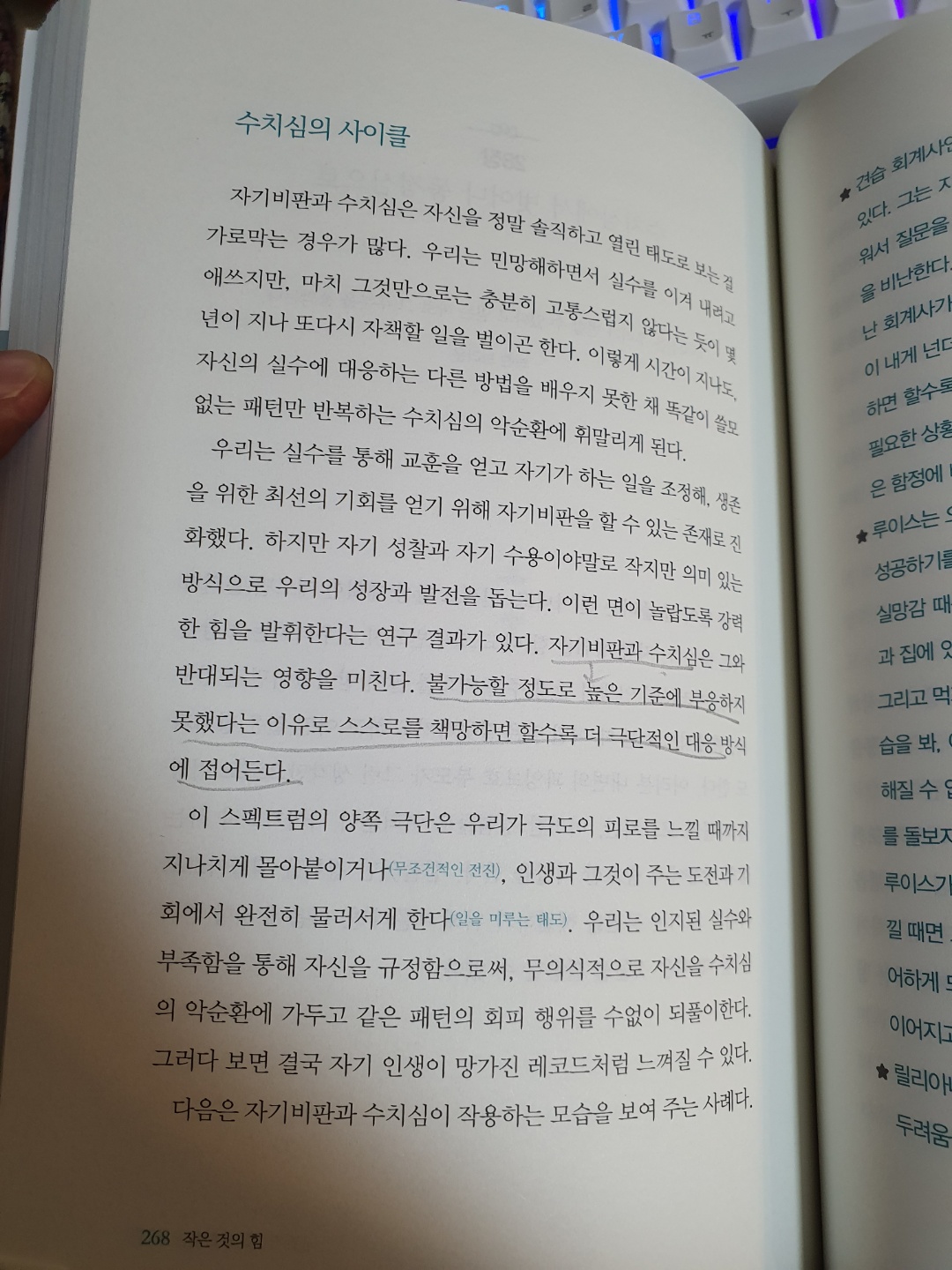P 268 : 자기비판과 수치심 불가능할 정도로 높은 기준에 부응하지 못했다는 이유로 스스로를 책망하면 할수록 더 극단적인 대응 방식에 접어든다.
