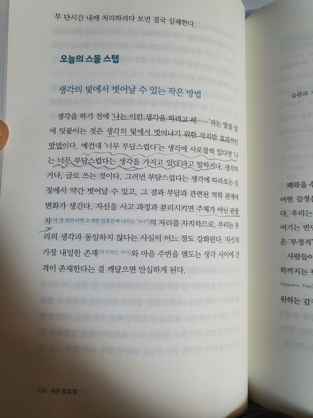 P 126 : '나는 이런 생각을 하려고 해 ...'라는 말을 앞에 덧붙이는 것은 생각의 덫에서 벗어나기 위한 작지만 효과적인 방법이다. 예컨대 '너무 부담스럽다'는 생각에 사로잡혀 있다면 '나는 너무 부담스럽다는 생각을 가지고 있다'라고 말하거나, 생각하거나, 글로 쓰는 것이다. 주체가 아닌 관찰자의 자리를 차지.