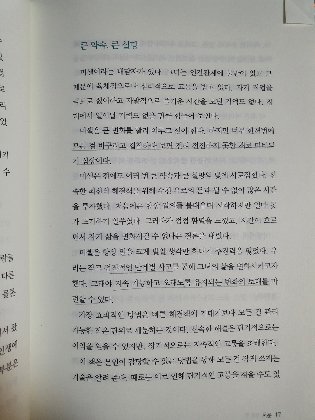 P17 : 모든걸 바꾸려고 집착하다 보면 전혀 전진하지 못한 채로 마비되기 십상이다. 점진적인 단계별 사고를 통해 지속 가능하고 오래도록 유지되는 변화의 토대를 마련할 수 있다.