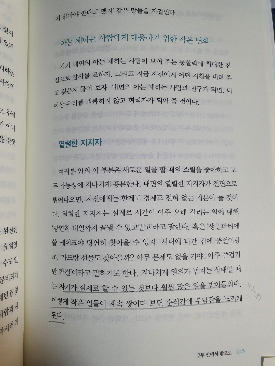 작가가 분리 해놓은 이론들을 읽어 내려가면서 무릎을 탁 치게 만들었던 내용이 있는데, '열렬한 지지자'의 모습이다. 우리 누구에게나 이런 모습이 다 있겟지만, 나에게 이 모습이 엄청 크게 작용했고 지금은 그 크기가 조금 줄긴했지만 여전히 활동이 중이다. 대학시절 같이 프로젝트를 진행하는 친구들은 나에게 '니가 말한 기간 * 3 을 하면 적절한 일정이다'라고 말했었다. 나는 항상 내 능력 이상을 생각하는데 그게 내가 컨트롤 할 수 없는 범위 이상이여서 큰 문제였고, 결국 그걸 해결해 내지 못하면, 자존감이 떨어지고 자괴감에 빠져 들곤했었다. 이 책에서 그런 모습에 대해서 설명 해주니 줄을 안 그을 수가 없었다. 그리고 그 모습을 인정 해주라는 것 까지. 그리고 작가는 감정을 글로 써보라고 말한다. 나도 힘들었을 때 글로 내 감정을 쏟아내는 걸 많이 했었고, 그 때 적었던 노트를 아직도 들고 있다. 아무런 두서 없이 그냥 나의 감정이 떠오르는 대로 적어 내려가다보면 어느순간 나도 모르게 씻겨 내려 가는 경우가 있다. 그 이후로 나는 꾸준히 내 감정을 글로 적어내고 있가.