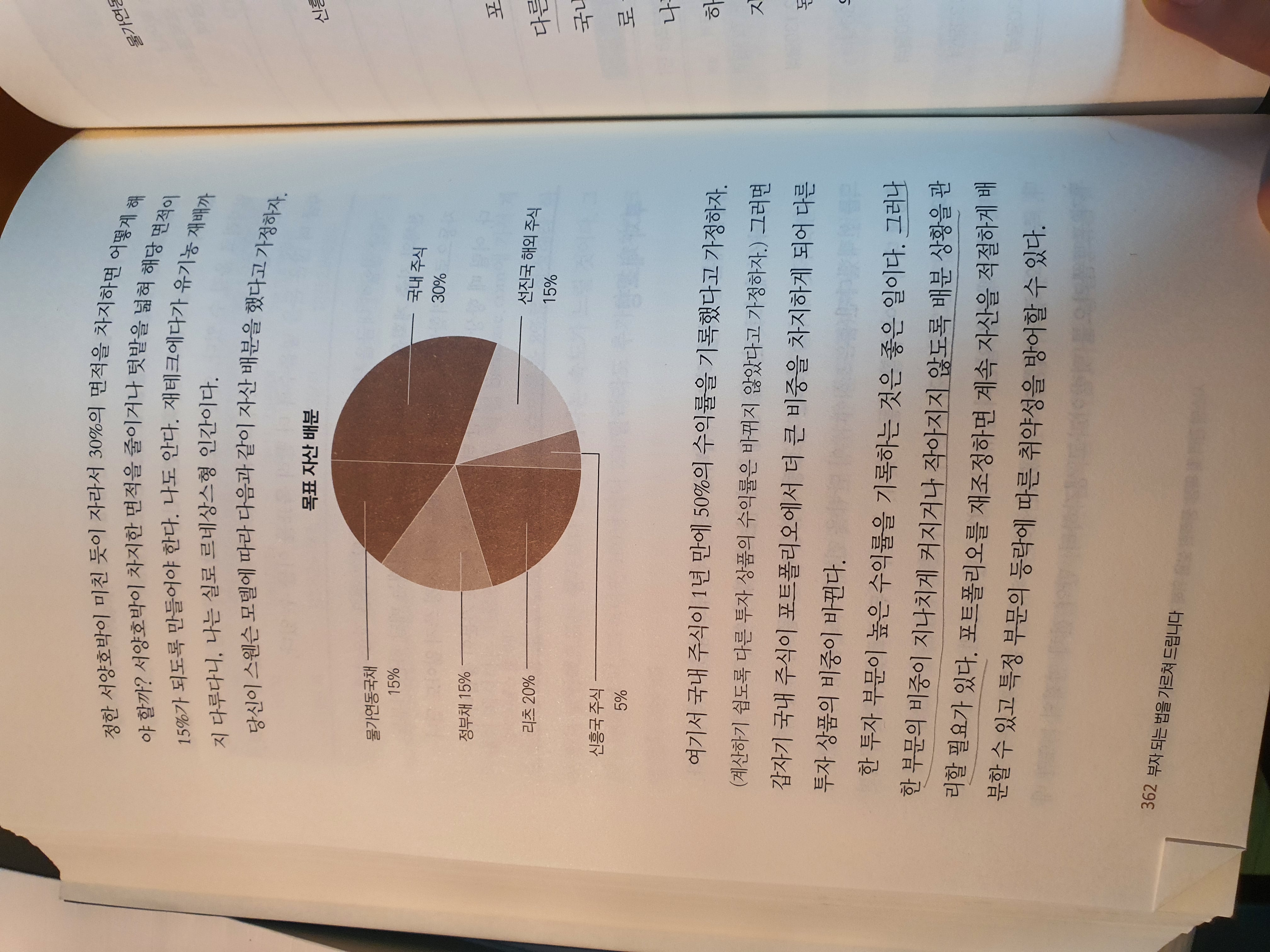 P362 : 한 부문의 비중이 지나치게 커지거나 작아지지 않도록 배분 상황을 관리할 필요가 있다. 포트폴리오를 재조정하는 최선의 방법은 원해 비중을 회복할 때까지 다른 부문에 돈을 더 넣는 것이다.