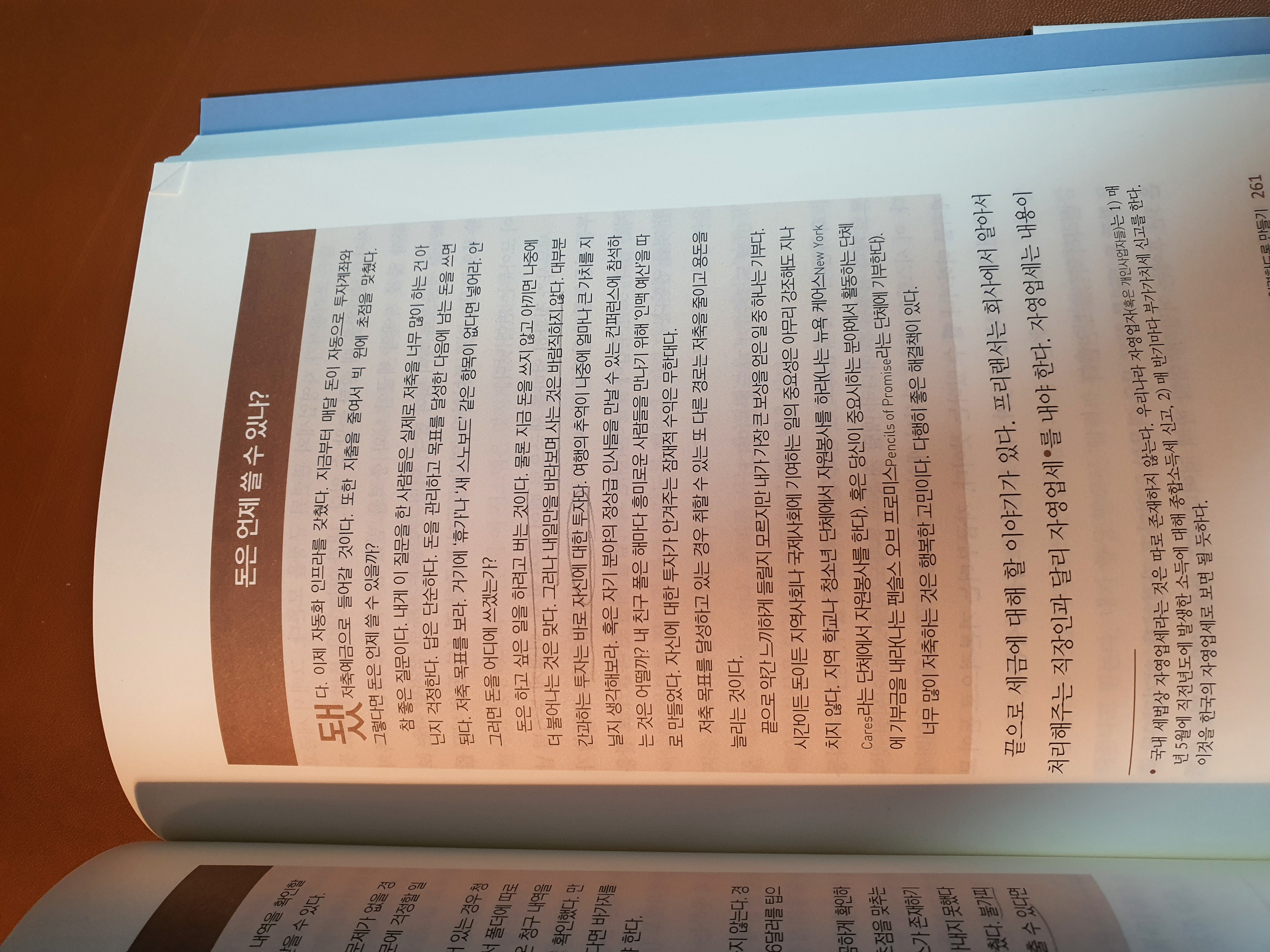 P261 : 돈은 하고 싶은 일을 하려고 버는 것이다. 물론 지금 돈을 쓰지 않고 아끼면 나중에 더 불어나는 것은 맞다. 그러나 내일만을 바라보며 사는 것은 바람직하지 않다. 대부분 간과하는 투자는 바로 자신에 대한 투자다.